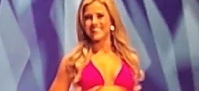 فخلال مرور الملكة على المسرح في حفل انتخاب ملكة جمال كاليفورنيا في الولايات المتحدة الاميركية، ارتفع جانب من البيكيني عند الصدر.